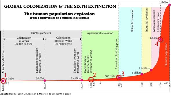 The exponentially increasing Sixth Extinction can be shown pretty convincingly to parallel humankind’s headlong expansion in numbers from literally 1 of a kind some 140 000 years back to over six billion individuals today. And this population explosion can be inseparably tied to three successive, seminal communication revolutions: language, writing and printing. It is ironic that it is our sheer genius that is propelling us towards our pending demise.